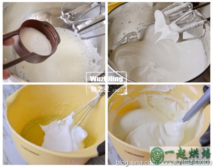 6、继续用电动打蛋器打发,剩下白糖分2次放入,打到蛋白呈硬性发泡,提起打蛋器呈小尖角状态