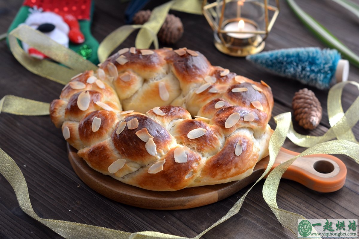 我这人做事其实不爱赶潮流,蹭热点更是缺少敏感度,甚至还有点懒惰+后知后觉。圣诞节还有些日子,突然间想编辫子了,索性就用面团来编吧,再围个圆圈状,成个圣诞花环也不错。但,我懒啊,所以,连个丝带也没缠上,光秃秃的就那么放着了;冬天要有雪,那就撒一点糖粉当飘雪如何?正好冰箱里还有一杯自制浓稠酸奶,我给用上了。