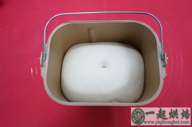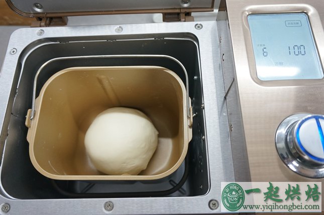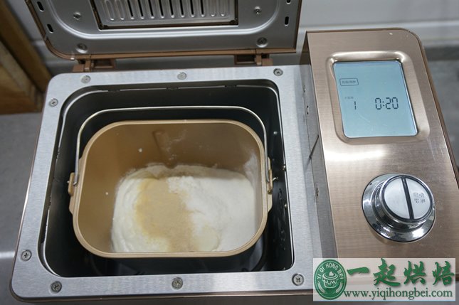 2. 除黄油外的材料全部入面包桶中,把桶安放进面包机中,启动揉面程序20分钟(如果没有面包机也可以参考手工揉面发酵步骤);