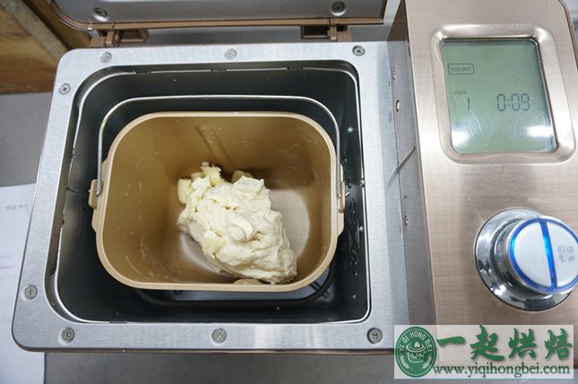 3. 10分钟后面团成型且能拉出粗膜后,加入黄油,继续揉完10分钟,再追加一个揉面程序10分钟;