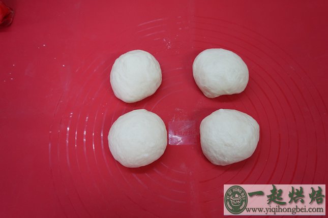 7. 面团取出放在揉面垫上,称重分成4等分,分别滚圆,盖保鲜膜松弛10分钟;