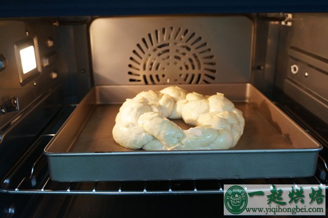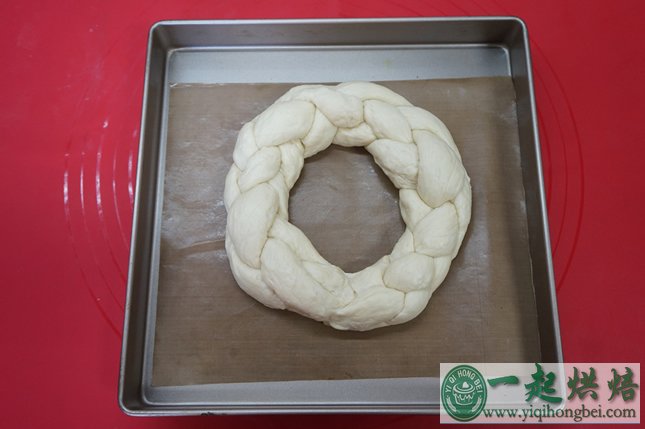 10. 盘成一个圆环,接口捏严,放在不粘烤盘内,油布可以不铺,放在温暖湿润处进行二次发酵,也可以放在烤箱中,35度左右,放一碗温水;